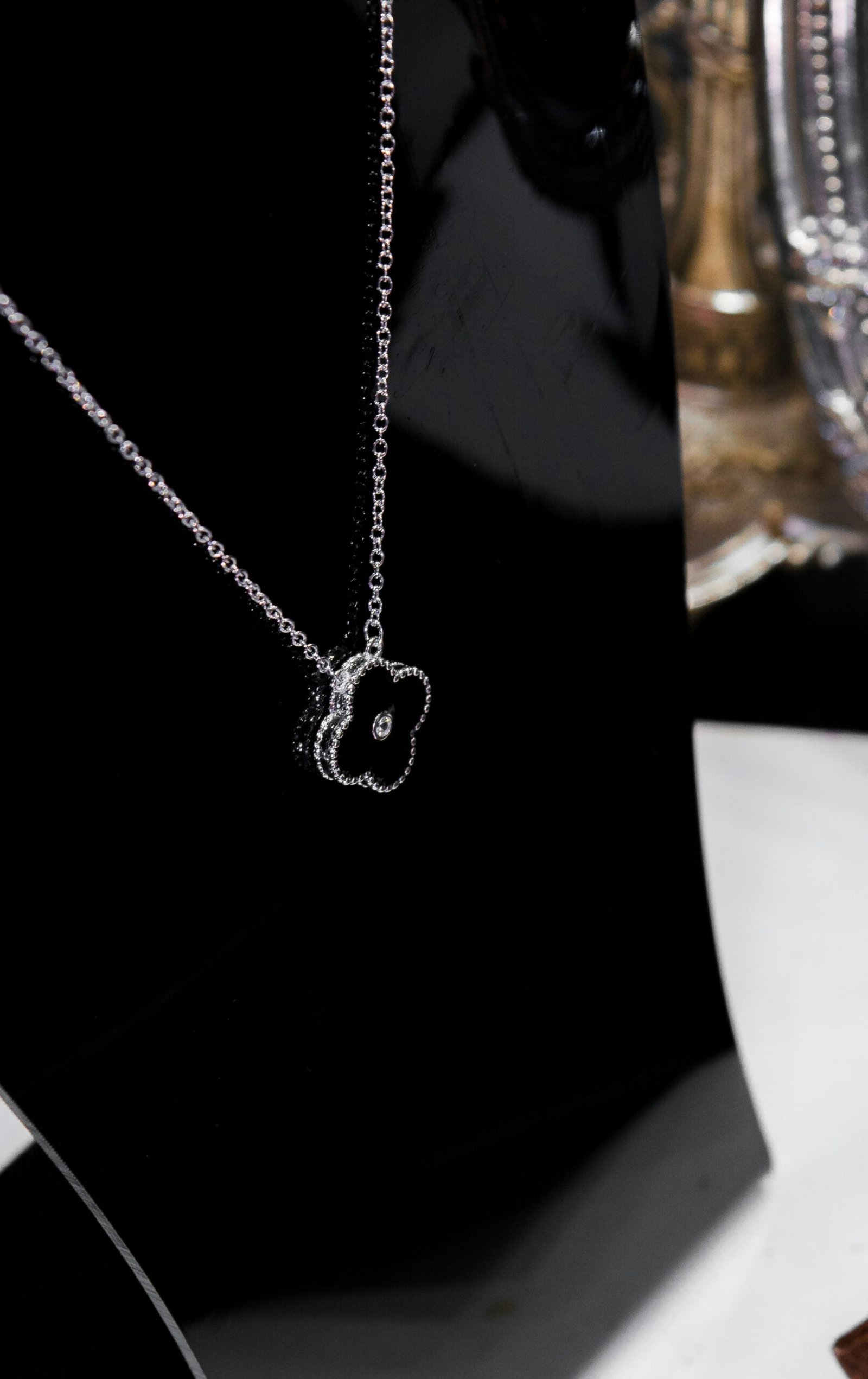 Nuit Blanche est un collier pensé comme un murmure. Fin, discret, presque impalpable, il épouse la courbe du cou avec la délicatesse d’un souffle. Sa ligne fluide laisse derrière elle une impression, un souvenir, une aura — comme le parfum subtil que l’on laisse en partant.